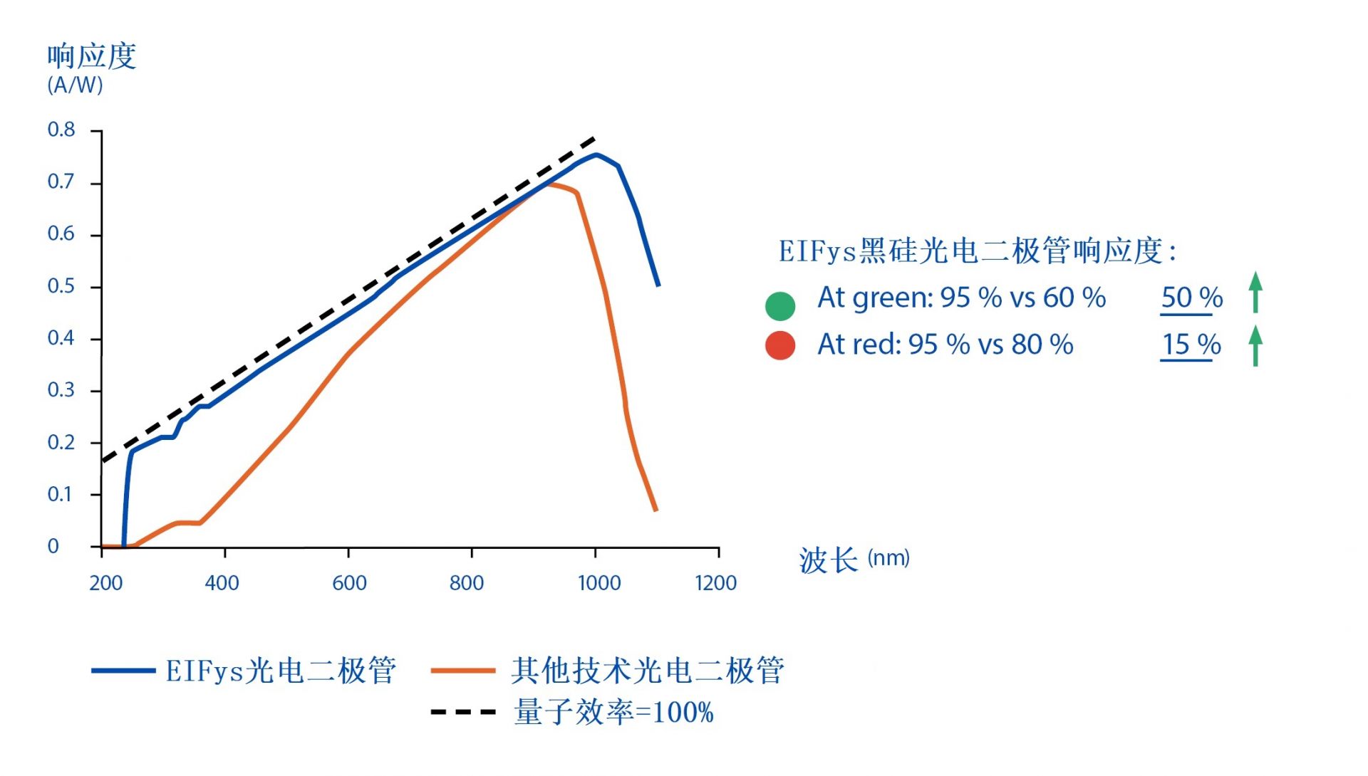 在智能手表等可穿戴設備中,需要高精度測量和滿足長續航時間才能滿足用戶的需求,在所有其他組件中,光電二極管是捕捉從皮膚反射的光信號的關鍵傳感器,因此,無論之后使用何種軟件AI算法,光電二極管的性能決定了原始數據的質量,光電二極管重要的參數之一是靈敏度,給定噪聲的條件下,更高的靈敏度意味著更高的SNR(信噪比),從而可以得到更準確的測量能力,可以檢測以前不可見的更小信號,與其他光電二極管技術相比,EIFys提供的高靈敏度光電二極管,采用黑硅技術,如下圖所示,綠光的響應度提高了50%左右,紅光的響應度提高了15%左右,光電二極管高靈敏度的另外一個好處是它可以用更少的光來達到同等的精度,這意味著更少的功耗,可提高穿戴設備的續航時間。