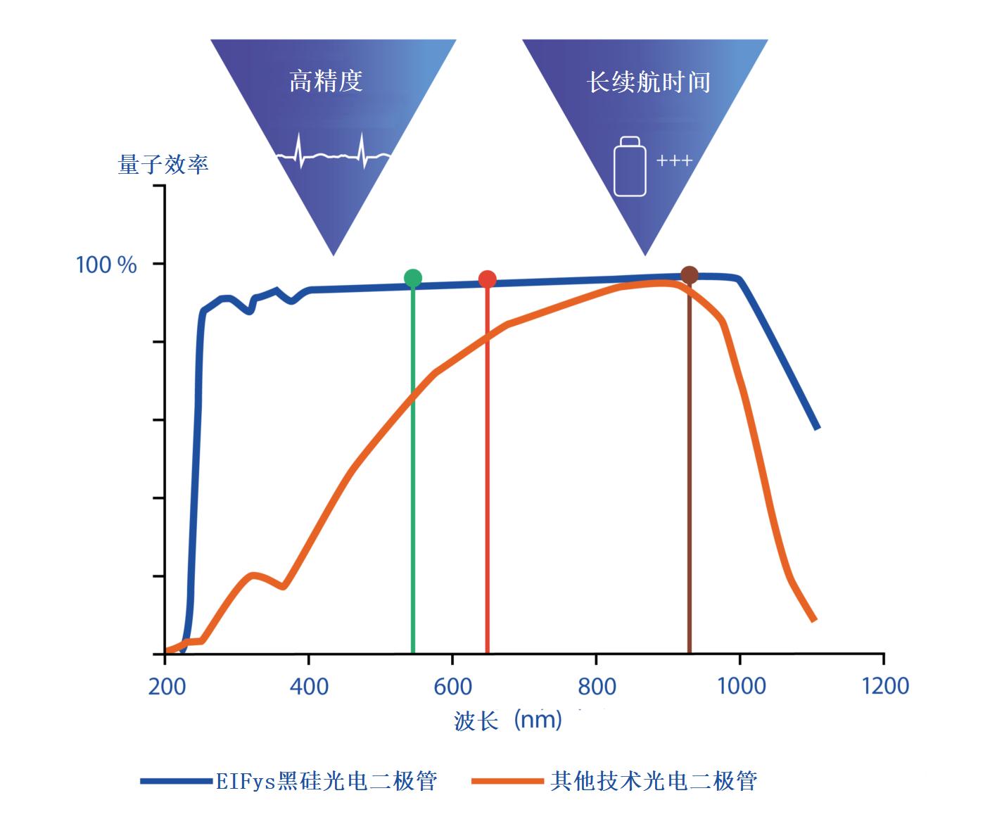 光電二極管是系統中原始信號的來源,EIFys能提供市面上靈敏度很高黑硅光電二極管,它在200-1100nm響應范圍內實現了近100%的量子效率,更靈敏的光電二極管,可以在給定的LED驅動電流下提供更好的測量數據精度,另一方面,光電二極管越靈敏,驅動LED所需的電流就越小,可降低系統的功率,提高續航時間。