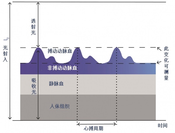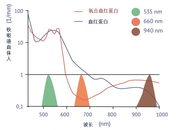 利用光電容積描記(PPG)是使用光電傳感器測量心率和血氧含量水平的基本方法,535nm綠光用于測量心率,皮膚中的血液量隨著心臟跳動周期而變化,因此綠光的吸收和皮膚對綠光的反射也會隨著周期變化,綠光的光信號變化頻率就是心率。同樣的,光的吸收也會根據血液中與血紅蛋白結合的氧氣水平而變化,由于660nm紅光和940nm紅外光對氧含量更敏感,因此660nm紅光和940nm紅外光的反射信號主要用來計算氧含量。