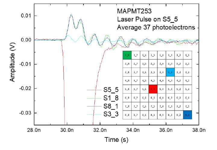 MCP-PMT在非??拷婵辗庋b(即管壁)的信號接口,經常會受到周邊陽極信號的反射影響。我們通過只針對中心S5_5進行多光子脈沖照射,然后分析不同區域的噪聲影響。如圖5所示: