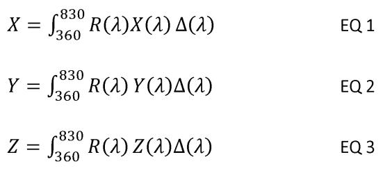 其中R(λ)是光譜輻射功率,X(λ),Y(λ),Z(λ)是CIE色彩匹配函數(shù),Δ(λ)是以納米為單位的數(shù)據(jù)增量。