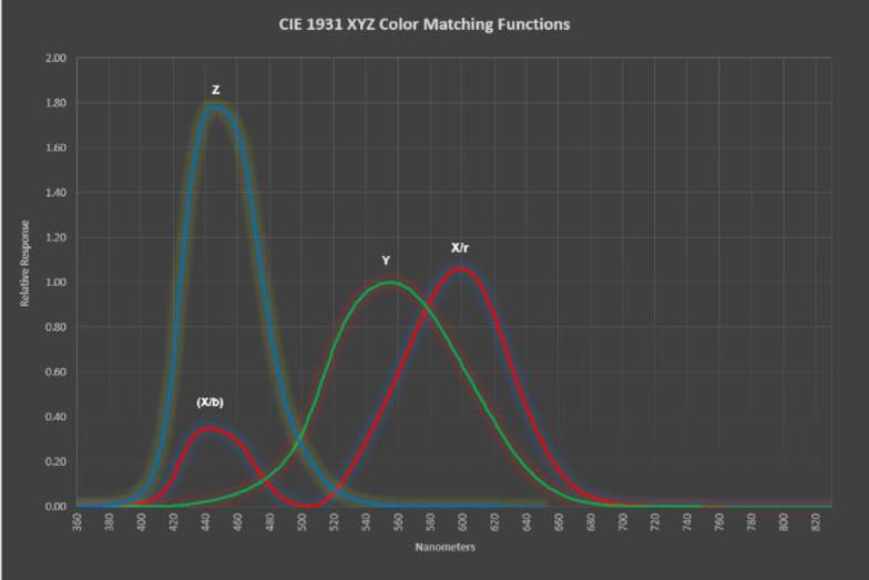 紅(兩片X/red和X /blue),綠(Y) 藍(lán)(Z)濾光片和探測(cè)器用于CIE 顏色匹配函數(shù),和人眼錐細(xì)胞的彩色視覺系統(tǒng)是相匹配的。這些功能也被CIE標(biāo)準(zhǔn)觀察者所驗(yàn)證。