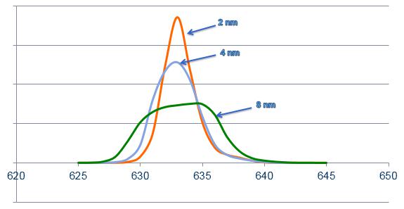 Photo Research公司已經(jīng)提供了30多年的光譜解決方案,并且是第一個(gè)引入自掃描多元素檢測(cè)系統(tǒng)的公司。我們的優(yōu)質(zhì)系統(tǒng),PR-7系列,具有穩(wěn)定的熱電冷卻探測(cè)器,多達(dá)八個(gè)測(cè)量孔徑和自動(dòng)同步功能,確保無論顯示器的頻率特性如何都可以保持精度。PR-740是靈敏度更高的,令人難以置信的閾值靈敏度為0.000015 cd / m2 ,可以測(cè)量一個(gè)被命令為0,0,0的OLED顯示屏!我們的PR-7系列的*新成員,PR-788具有500,000,000:1的令人難以置信的動(dòng)態(tài)范圍,使其成為任何商用顯示產(chǎn)品的光譜對(duì)比度測(cè)試的解決方案。PR-6系列具有電池供電,便攜性,占地面積小和手持操作等特點(diǎn)。PR-680具有雙檢測(cè)器 --二極管陣列和光電倍增管(PMT),可以使用同一臺(tái)儀器進(jìn)行高精度的基于光譜的光譜和時(shí)間(上升時(shí)間,閃爍)測(cè)量。所有PR-7系列解決方案都具有自動(dòng)改變帶寬的功能。分光輻射計(jì)的帶寬由出口狹縫的尺寸和衍射元件(光柵)的分辨率控制,光譜帶寬在峰值的全寬半高(FWHM)處測(cè)量.圖6是使用具有可變帶寬特征的HeNe激光器(632.8nm)的PR-740的測(cè)量結(jié)果。注意,盡管4nm和8nm測(cè)量的峰較低,但每條曲線下的面積相等。