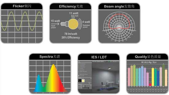 隨著LED在商用照明中的廣泛應用,針對LED照明燈具的相關測試標準也日臻完善。由北美照明學會(IES)發布的LM-79指出了LED產品的測試方法和內容,測試的內容就包含光源的顏色參數(CRI等),光通量,光效,光強分布,色度以及功率,電壓,電流,功率因數。由CIE發布的S:025標準,也規定了LED燈具或模塊的電參數,光度,色度測試要求。其中就包含LED燈具的總光通量,光效,部分光通量,光強分布,中心光強,亮度,亮度分布,色坐標,色溫,顯色品質。