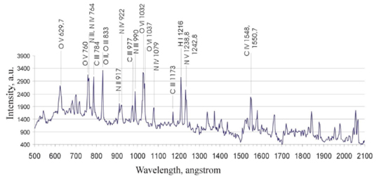 在等離子體參數較低的小型托卡馬克裝置上,等離子體的輻射主要位于真空紫外和可見光波段。下圖為捷克一個小托卡馬克裝置 CASTOR 中的等離子體發射光譜,主要在真空紫外和可見光波段。其線狀譜主要是 O,N和 C 的雜質譜線。從等離子體發射光譜圖上可以較為容易地辨別等離子體中雜質的種類和電離狀態。以 C 為例,譜線上標志的光譜符號和相應的電離態的關系如下表所示: