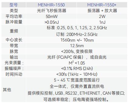 無論是實(shí)驗(yàn)室自搭,建還是高科技公司商品化的基于鎖模飛秒激光器的光頻梳,其飛秒激光器部分都是整個(gè)光梳系統(tǒng)內(nèi)硬件成本占比最高的部分。其中瑞士Menhir公司的GHz重復(fù)頻率的光纖飛秒激光器在搭建GHz大梳齒間隔的光頻梳應(yīng)用上為廣大科研以及OEM用戶所接受與推崇。其常用產(chǎn)品分為250MHz,1GHz,2.5GHz三種重復(fù)頻率的型號(hào),波長(zhǎng)在1545-1565nm,脈沖寬度250fs; 重復(fù)頻率越高價(jià)格越高。
