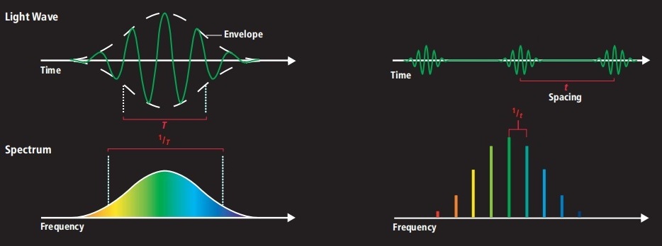 對(duì)于第一個(gè)問題,“為什么要采用高重復(fù)頻率的飛秒激光器搭建光頻梳”?大致來源于一個(gè)由來已久的誤會(huì)。很簡(jiǎn)單,如果用鎖模飛秒激光器架構(gòu)光頻梳,光頻梳的梳齒間距就是飛秒激光器自身的重復(fù)頻率。也就是說250MHz重復(fù)頻率的飛秒激光器可以用來搭建250MHz梳齒間距的光頻梳,而1GHz重復(fù)頻率的飛秒激光器可以用來搭建1GHz梳齒間距的光頻梳。小編說過,對(duì)于Menhir廠家的產(chǎn)品而言,重頻越高則激光器價(jià)格越高。那么,光頻梳難道不是梳齒越精細(xì)越好么?我還有什么理由買更貴的激光搭建梳齒間隔更寬的光頻梳呢?