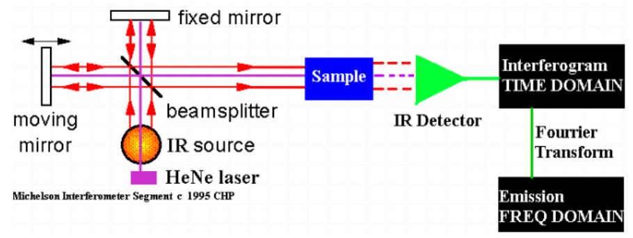 如上圖,紅外復合光源通過半透半反鏡后,分別經過動鏡(Moving Mirror)和固定反射鏡(Fixed Mirror)后,兩路反射回的光發生干涉。干涉光通過樣品后,通過紅外探測器后被記錄下來。在動鏡以恒定速度移動時,探測器就會記錄下光強隨時間的變化關系。通過一系列的傅里葉變換和計算,就可以得到光強隨頻率的變化,從而得到光強隨波長變化的關系。