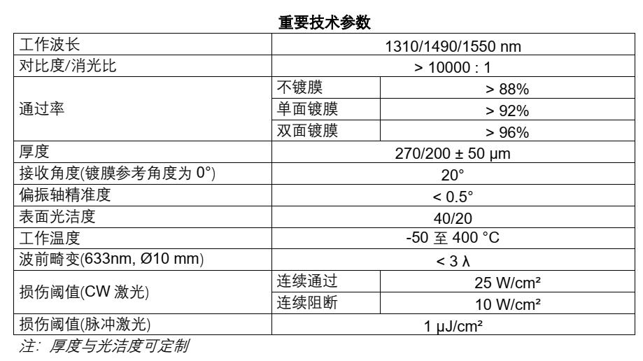 - 隔離器和環(huán)形器的應(yīng)用:偏振片在隔離器和環(huán)形器中也有應(yīng)用,這些組件主要用于保證光信號(hào)在光路中單向傳輸,避免反射光對(duì)系統(tǒng)性能的影響。