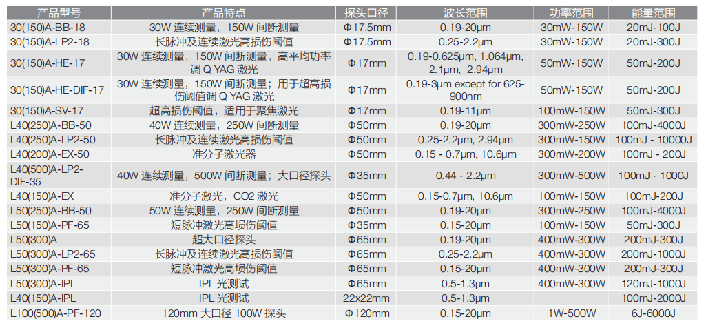 波長響應范圍:0.15-20 um; 連續(xù)測量高達50W,間歇測量可達150W 多種吸收膜層選擇適合連續(xù)、短脈沖、高能量密度和高能量密度