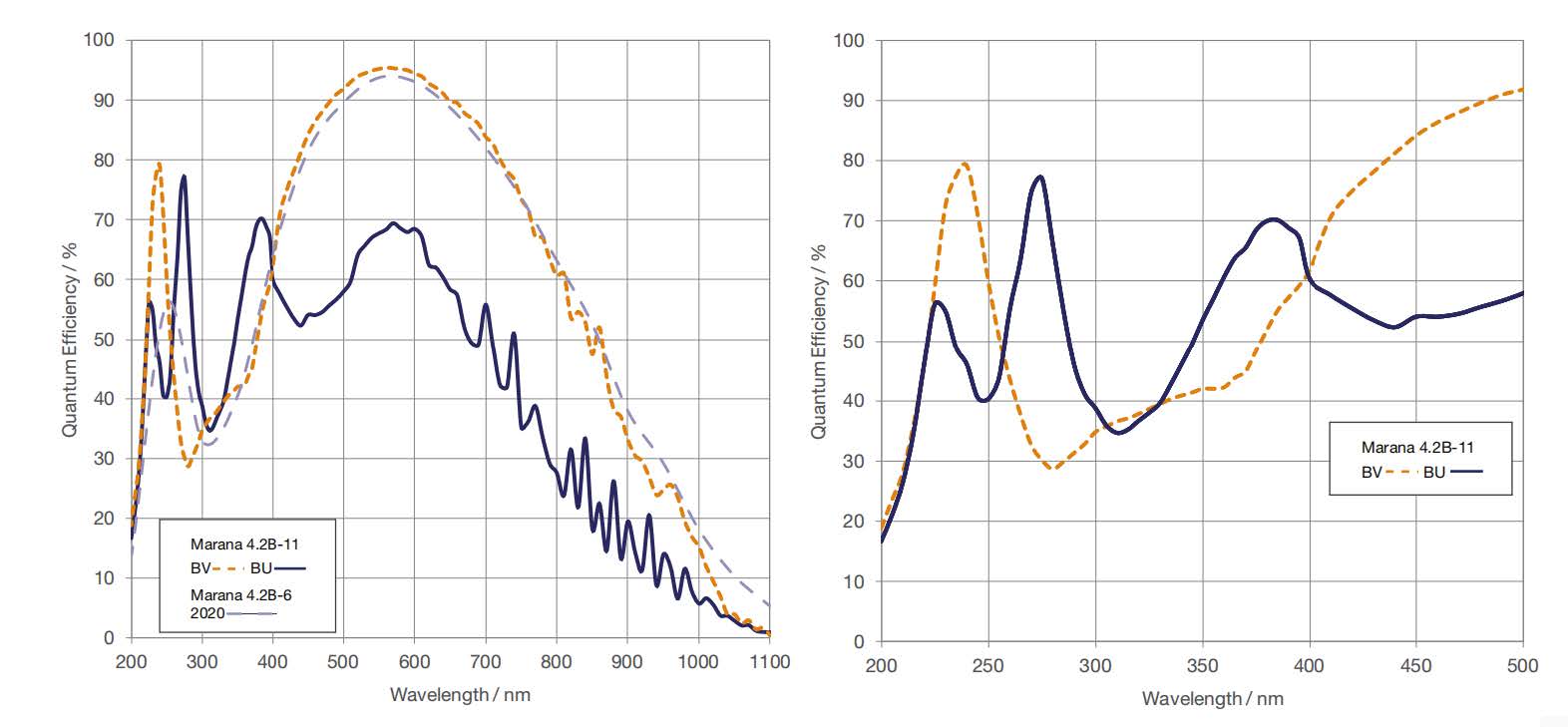 Marana 背照式sCMOS 相機提供95%的量子效率,采用Andor 獨特的真空密封技術,制冷溫度達到-45 度,可大大降低噪音。背照式傳感器是為增強靈敏度而選擇的,選用這種技術來設計制造超靈敏的相機是有意義的。此外,UV 優化版本可覆蓋低于400 nm 的范圍。