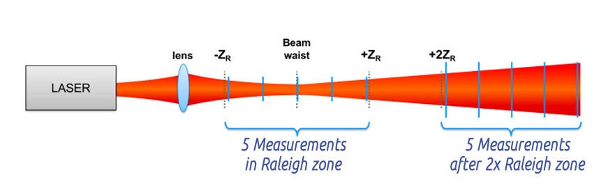 ISO規(guī)范了一種從一組光束直徑測量值中計算M²因子的方法,以最大限度地減小誤差。在測量過程中,激光束首先需要用高光學質量、已知焦距的透鏡聚焦。然后,使用陣列探測器或掃描狹縫輪廓儀在光束的不同位置測量光束寬度。