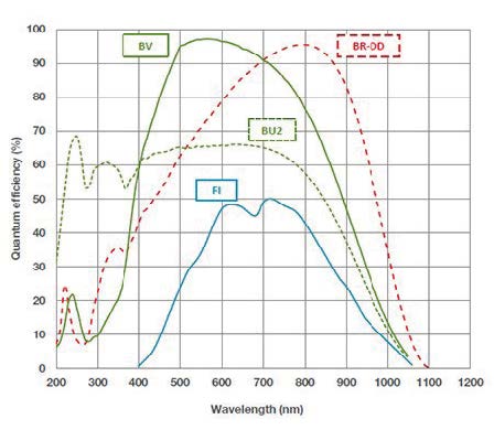 FI:前感光CCD BV:背感光,可見波段優(yōu)化 BU2:背感光,紫外增強250nm 優(yōu)化 BR-DD:背感光深耗盡CCD。帶有消除近紅外波段的etalon 鍍膜 |