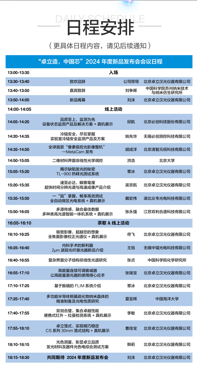 北京卓立漢光儀器有限公司將于2024年1月26日在北京舉辦“卓立造,中國芯”——2024年度暨卓立漢光25周年系列活動(第一輯),屆時將為大家解鎖多款自主研發(fā)的新產(chǎn)品和解決方案,重磅新品現(xiàn)場揭秘,業(yè)內(nèi)專家齊聚會談,共話光電新品與未來。