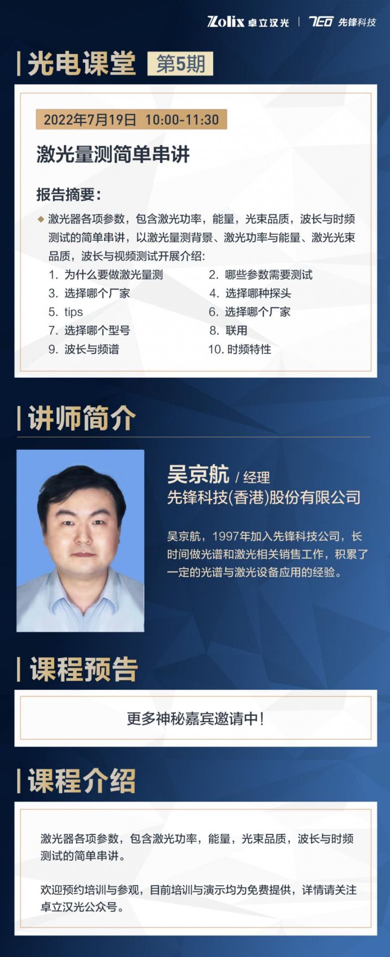 為多方位展現(xiàn)光電儀器研制領域的最新成果,使客戶進一步了解和熟悉光電產(chǎn)品及應用,卓立漢光&先鋒科技秉持“優(yōu)質(zhì)服務”的理念,特別策劃制作《光電課堂》網(wǎng)絡專題直播課。歡迎預約培訓與參觀,目前培訓與演示均為免費提供,詳情請關注先鋒公眾號。